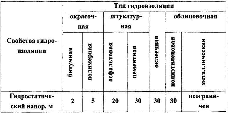 В зависимости от гидростатического напора область применения различных типов гидроизоляции определяется по таблице 1.
