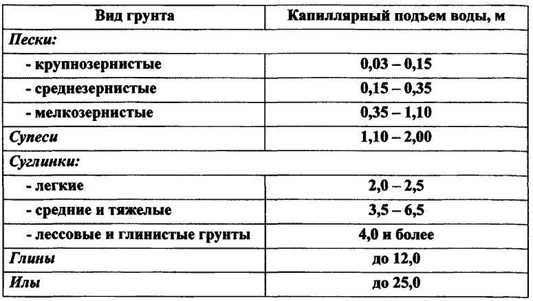 Гидроизоляцию конструкций необходимо предусматривать выше максимального уровня грунтовых вод не менее чем на 0,5 м. Выше максимального уровня грунтовых вод конструкции должны быть изолированы от капиллярной влаги. Средние значения максимального поднятия капиллярной воды в зависимости от вида грунта приведены в таблице 2.
