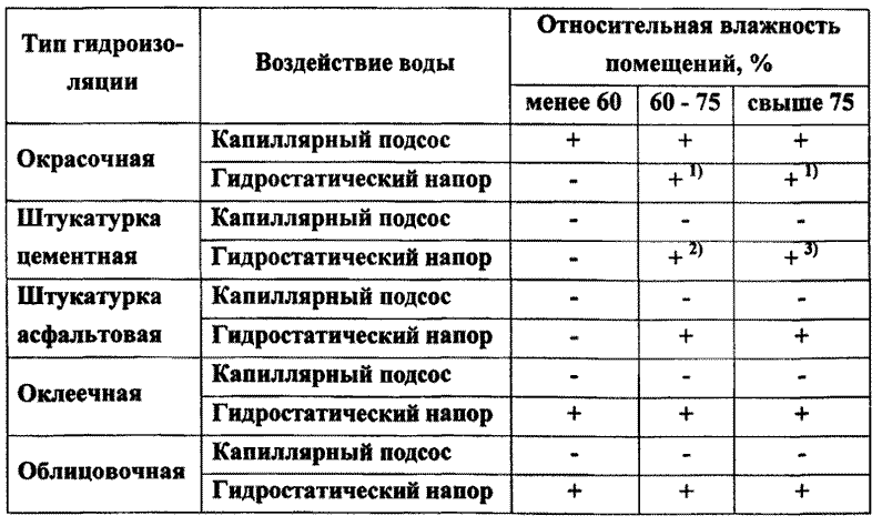 В зависимости от допустимой влажности внутреннего воздуха в подземных помещениях (подвалов, тоннелей, венткамер и др.) тип гидроизоляции следует назначать в соответствии с таблицей 3.