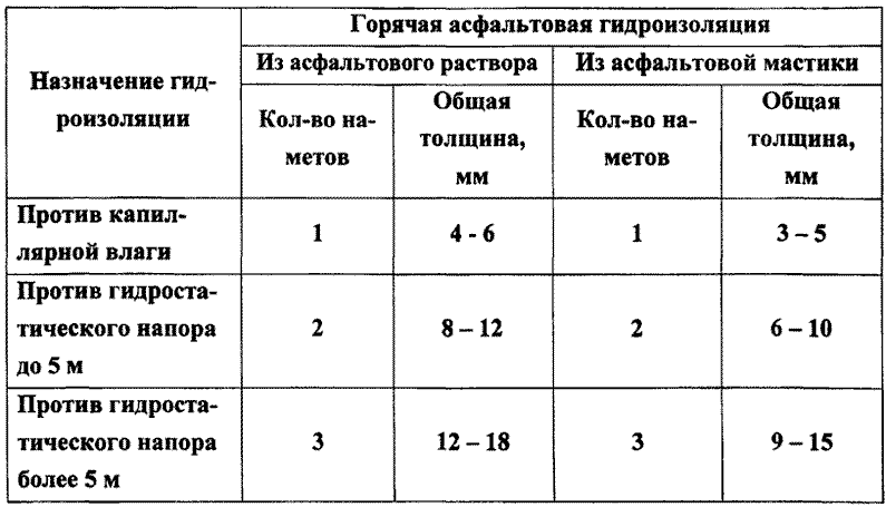 Горячая асфальтовая гидроизоляция выполняется из горячих асфальтовых мастик или растворов, наносимых на изолируемую поверхность в расплавленном виде. Температура нагрева составляет 150-190 °С. Такие мастики или растворы получают путем смеси битумов с порошкообразным или волокнистым заполнителем и с применением в случае необходимости полимерными или пластифицирующими добавками. Горячую асфальтовую гидроизоляцию следует предусматривать со стороны напора или увлажнения без применения, как правило, защитного ограждения.