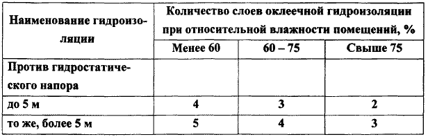 Количество слоев оклеенной рулонной или листовой гидроизоляции на битумной, битумно-полимерной или синтетической основе следует назначать в зависимости от величины гидростатического напора воды и допустимой относительной влажности в защищаемом помещении согласно таблице 5.
