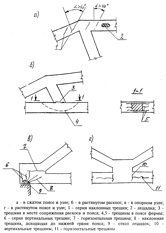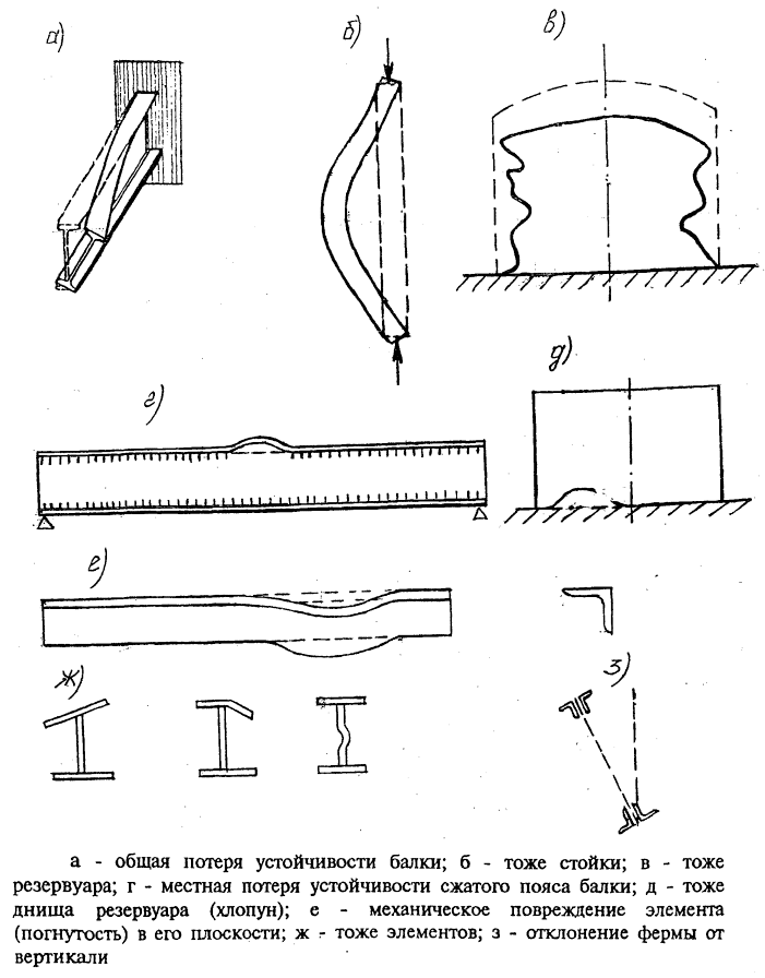 | 5 | Наличие трещин в основном металле в особенности в растянутых и изгибаемых элементах. Прогибы балок и ферм более 1/50 пролета. Потеря общей устойчивости балок и сжатых элементов ферм. Разрыв отдельных растянутых элементов |