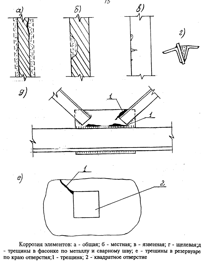 Местная просадка под днищем глубиной не более 150 мм на площади не более 2 м, образование зазора между днищем и основанием от его осыпания. Выпучины и вмятины на поверхности стенок до 60 мм. Коррозия на отдельных участках или на всей длине вертикальных и горизонтальных сварных соединений внутренней поверхности стенки резервуара. Характер коррозии: точечные углубления осповидного типа и группа раковин глубиной от 2 до 3 мм, переходящие в сплошные полосы. Коррозия внутренней поверхности первого пояса стенки на значительной длине в зоне примыкания к днищу. Характер коррозии: группы раковин глубиной до 1,5 мм, а также точечные углубления осповидного типа. Пластинчатая ржавчина покрытия с уменьшением площади сечения элементов до 15 %. |
