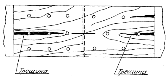 Рис. 18 - Трещины в растянутом стыке деревянной конструкции