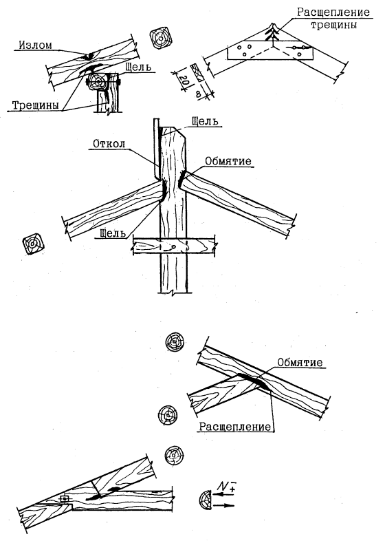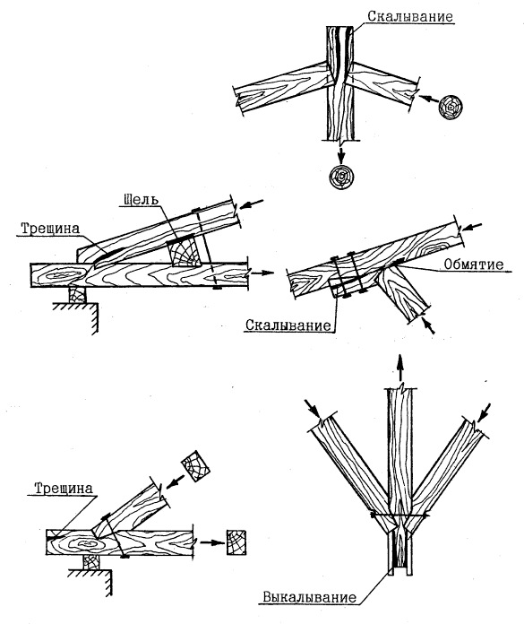 | 4 | Глубокие трещины в элементах. Трещины, в работающих на скалывание торцах по ширине более 25 % от толщины элемента. Сильное обмятие и зазоры более 3 мм в рабочих поверхностях врубок. Смятие древесины вдоль волокон по линии болтов и нагелей на 1/2 их диаметра. Потеря местной устойчивости элементов конструкций. Прогибы изгибаемых элементов более 1/75 пролета. | Гниль в местах заделки балок в наружные стены. Гниль в мауэрлате, стропилах, обрешетке, накате, снижающая прочность до 25 %. |