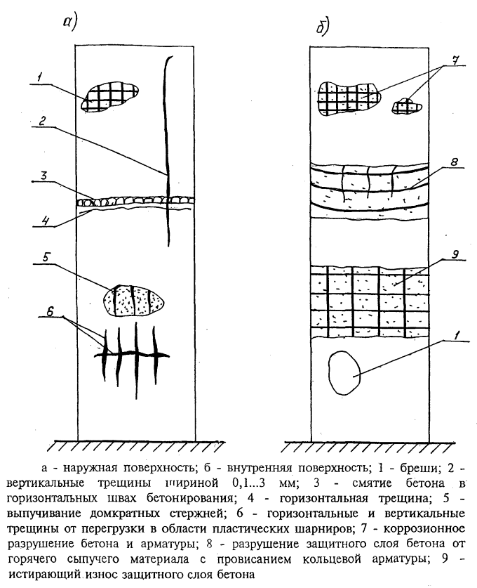 | 5 | Выпучивание вертикальных арматурных стержней ствола. Раздробление бетона сжатой зоны. Прогибы трубы более 1/100 высоты. Трещины в стволе более 2 мм |