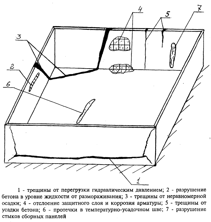 Рис. 27 - Повреждения ж.б. прямоугольных резервуаров