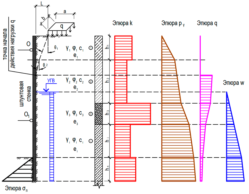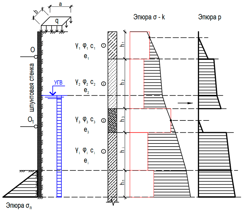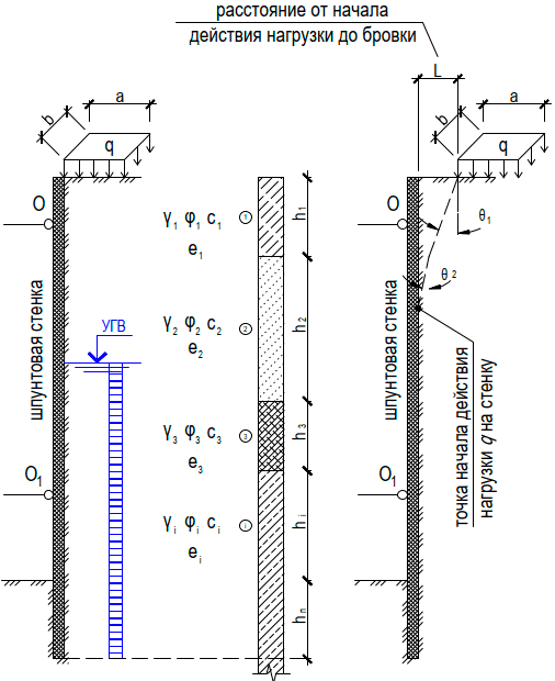 1. Пусть имеется шпунтовая стенка, прорезающая несколько слоев грунтового массива. Кол-во прорезаемых слоев - i. На поверхность массива у бровки действует также некая нагрузка q, распределенная по площадке размерами a x b. Указанная нагрузка также может быть полосовой шириной a, либо быть равномерно-распределенной по всей поверхности (например, снеговая нагрузка). Кроме того, нагрузка может находиться не непосредственно у бровки котлована или траншеи, а на некотором расстоянии L от нее. Каждый из слоев грунтового массива характеризуется величинами его физико-механических характеристик: плотностью γi, углом внутреннего трения φi, удельным сцеплением сi, пористостью ei. См. рис. 1.