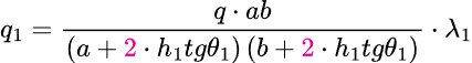 Следует обратить внимание, что коэффициент при размере пятна нагрузки, перпендикулярном плоскости шпунтовой стены b, равен 2,0 (в формуле выделено сиреневым цветом), поскольку нагрузка вдоль шпунтовой стены распространяется в обе стороны, а перпендикулярно стене - только в одну сторону в силу того, что нагрузка находится непосредственно у бровки.