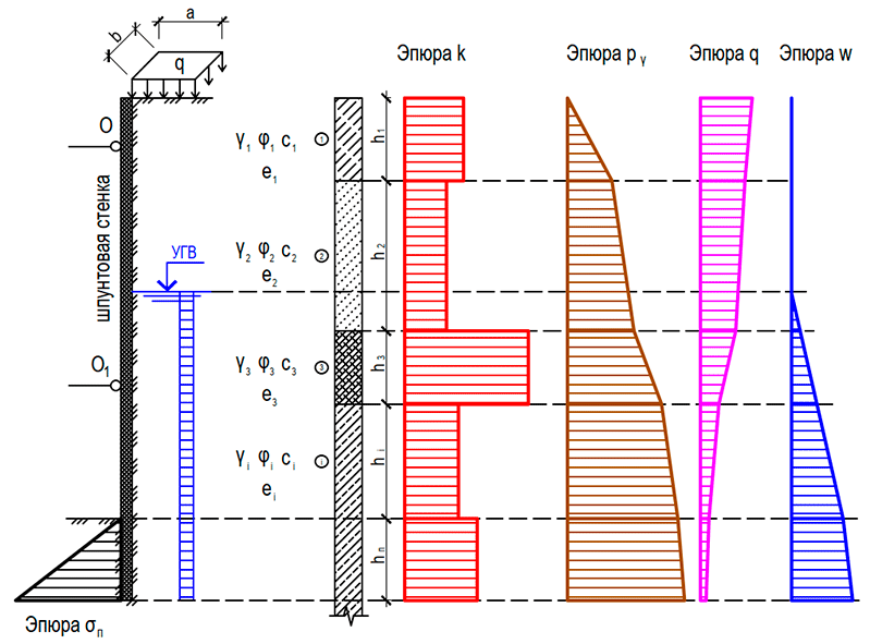 Высота слоев hi. Шпунтовая стенка может иметь один, два или более ярусов распорных креплений (точки О, О1 и т.д. на рис. 1).