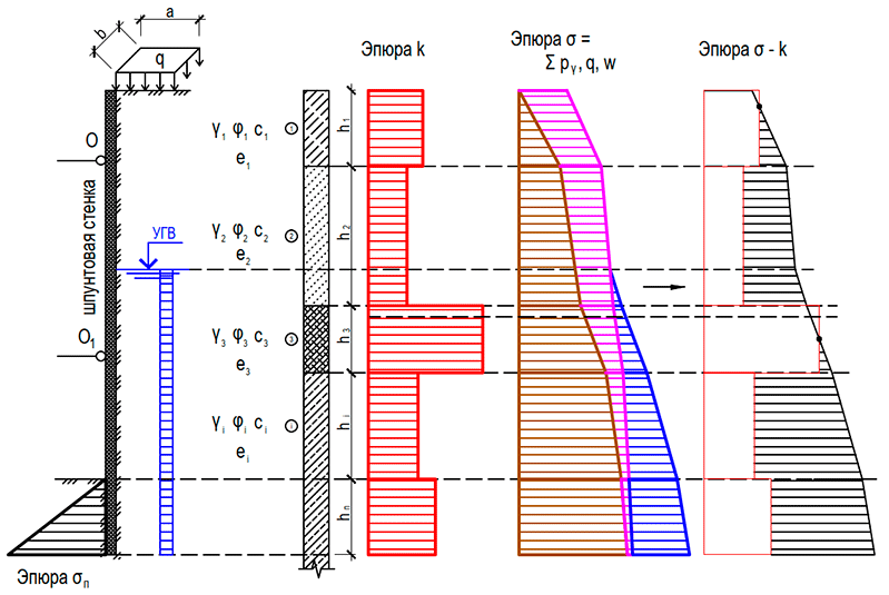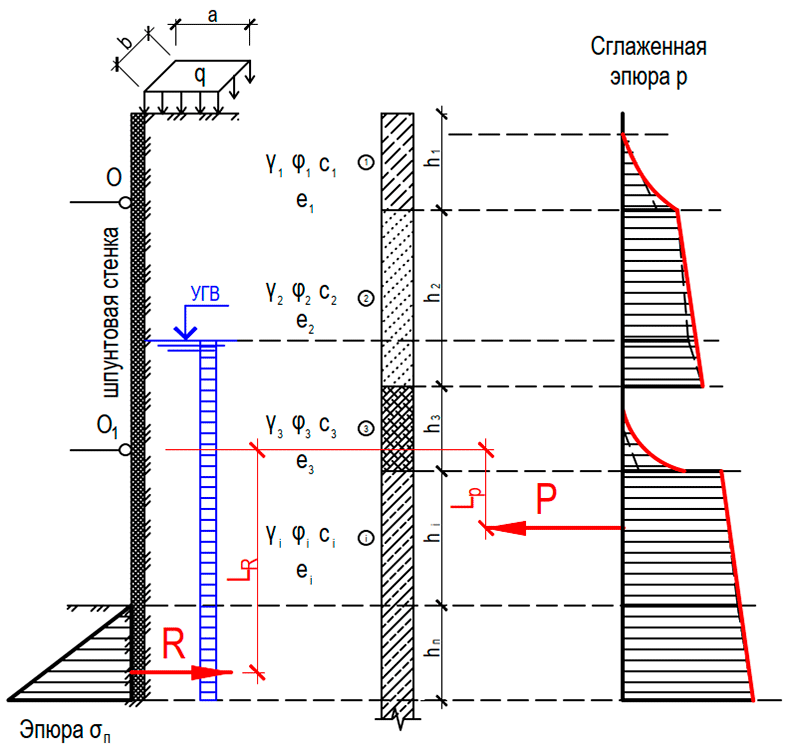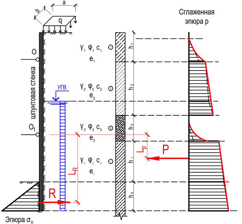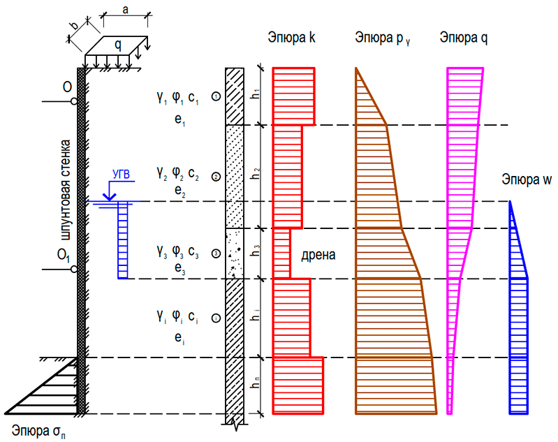 Шпунтовая стенка предполагает удерживание грунтового массива после выемки грунта из траншеи или котлована. Острие шпунтовой стенки прорезает нижележащие слои массива, которых тоже может быть несколько (данные слои не рассматриваем; пассивный отпор этих слоев будет вычисляться аналогично активному давлению грунта, о чем будет сказано ниже).