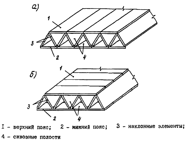 Плотный пространсгвенный фундамент (рис. 1) монтируется из плоских железобетонных панелей и имеет верхний (I) и нижний (2) пояса и наклонные (3) элементы, которые образуют сквозные полости (4) треугольного сечения. Фундамент устраивается под всем сооружением в виде отдельных не связанных между собой блоков.