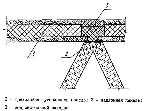 Необходимая жесткость и неизменяемость пространственной системы плитного фундамента обеспечивается при шарнирном соединении плоских панелей сваркой закладных деталей. Стыковые узлы сборных элементов фундамента приведены на рис. 2. Узел опирания трехслойных панелей со слоем утеплителя на наклонные элементы приведен на рис.З, нижний и верхний слой панелей при легких нагрузках объединяютоя о помощью гибких стальных связей для средних нагрузок - с помощью железобетонных шпонок.