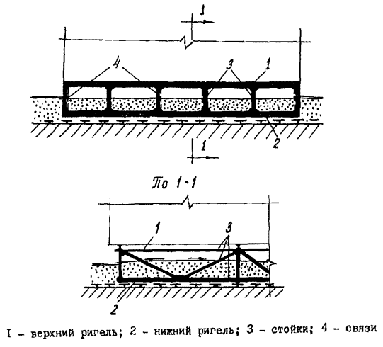 Рамные фундаменты (рис.5) представляют собой сквозную конструкцию, состоящую из горизонтальных ригелей (I) и (2) вертикальных стоек (3), соединенных с ригелем жесткими узлами, воспринимающими моментные усилия. В пространственную систему фундамент объединяется о помощью связей (4).