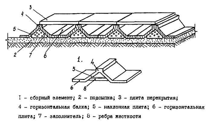 Фундамент - оболочка в сборно-монолитном варианте (рис. 5) собирается из отдельных железобетонных элементов (I), имеющих выпуски арматуры по периметру, которые устанавливаются вдоль поперечных осей здания на подсыпку (2), и перекрываются плоскими плитами (3). Железобетонные элементы состоят из верхней утолщенной горизонтальной балки (4) для опирания поперечных и продольных панелей или стен зданий, переходящей в две наклонные плиты (5), которые, в свою очередь, переходят в нижние горизонтальные плиты (6). Между наклонными плитами внутренней полости элемента расположены подкрепляющие ребра жесткости (8), шаг которых зависит от конструкции здания. Для зданий до 3-х этажей элементы фундамента - оболочки могут применяться без подкрепляющих ребер жесткости.