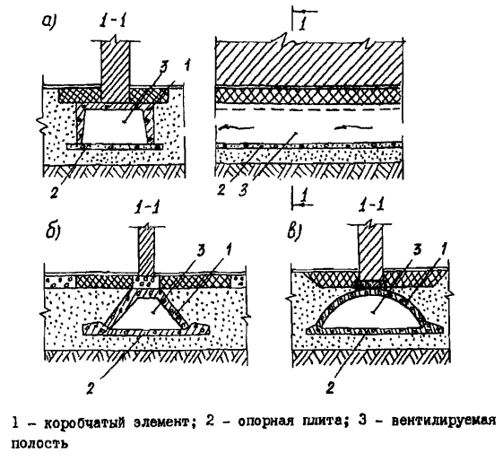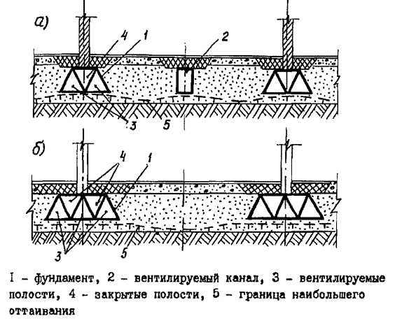 Ленточный фундамент монтируется из коробчатых (рио. 7) или плоских (рис. 8) железобетонных элементов. Между лентами фундаментов отсыпается подсыпка, на которой устраиваются полы первого этажа. Сквозные полости фундаментов служат для охлаждения грунтов основания при движении по ним холодного воздуха в зимнее время. Поперечное сечение вентилируемой полости может иметь прямоугольную (рис. 8а), треугольную (рис. 7б), полукруглую (рис. 7в), многоячеистую (рис. 8) и др.формы.
