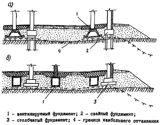 Пространственные вентилируемые фундаменты совмещают функции несущей фундаментной конструкции и охлаждающего грунт устройства, фундамент представляет собой тонкостенную железобетонную складчатую сиотему, монтируемую на подсыпке жз плоских панелей, коробчатых или складчатых элементов, объемных полых блоков. Охлаждение грунта основания, обеспечивающее сохранение его мерзлого состояния, осуществляется в зимнее время при движении наружного холодного воздуха в свободном пространстве фундамента.