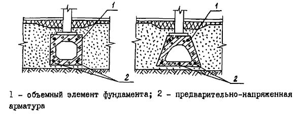 Для повышения трещиностойкооти ленточных фундаментов, монтируемых из сборных объемных элементов, целесообразно использовать предварительно напряженную арматуру (рис. 10).