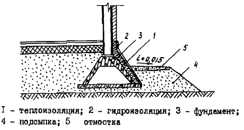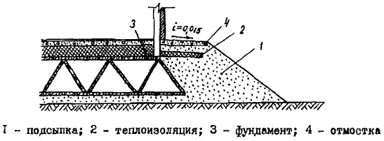 По внешнему контуру здания или сооружения с целью уменьшения сезонного оттаивания под наружными стенами должна быть отсыпана внешняя берма подсыпки (рис. 12). Размеры бермы определяются с учетом необходимых габаритов для работы строительных механизмов, а также теплотехническим расчетом. Примеры конструктивных решений приведены на рис. 12 и 13.