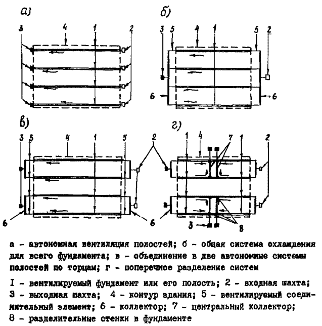 Охлаждающие элементы, которыми служат вентилируемые полости фундаментов, могут работать автономно (рис. 14а) или быть объединены в систему, включающую фундаменты под всей площадью здания (рио. 14б), или фундаменты под частью здания (рис. 14в). Объединение осуществляется с помощью коллекторов, которые размещаются по торцам фундамента во внешней берме подсыпки (рис. 14б,в). Если протяженность вентилируемых полостей фундамента велика (свыше 80-100 м) и не позволяет создать движение по ней воздуха с необходимой для охлаждения грунтов скоростью, то в среднем поперечном сечении предусматриваются разделительная стенка и дополнительные центральные коллекторы, разбивающие каждую из вентилируемых полостей фундамента на две автономные, объединяемые в свою очередь в системы охлаждения (рис. 14г).