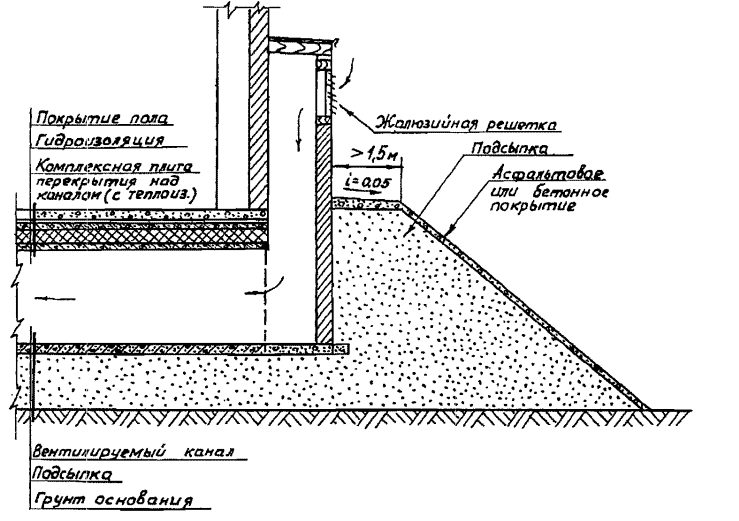 При движении воздуха но охлаждающим элементам за счет ветрового и теплового напоров (естественная вентиляция) входные и выходные отверстия вентилируемых полостей или коллекторов оборудуются специальными шахтами. Входными являются шахты, располагающиеся со стороны преимущественного направления ветров (наветренной стороны здания или сооружения), их высота определяется исходя из условия, что отверстия для входа воздуха должны располагаться выше отметки максимальных снеговых отложений в районе строительства (рис. 15). Шахты, находящиеся с подветренной стороны, служат для выхода воздуха, их высота определяется вентиляционным расчетом (рис. 16) из условия создания перепада давлений на входе и выходе, необходимого для движения воздуха по полостям с заданной скоростью. Отверстия шахт оборудуются жалюзийными решетками. Шахты могут непосредственно примыкать к наружным стенам здания или сооружения или размещаться от них на некотором расстоянии.