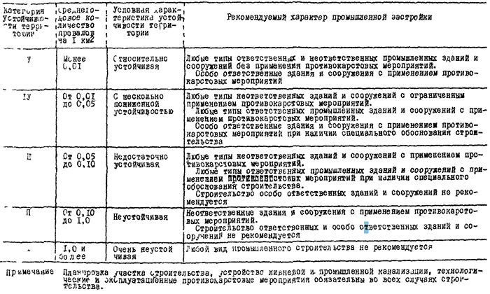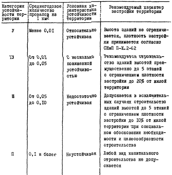 Для определения пригодности под застройку территорий в районах распространения карста в зависимости от среднегодового количества провалов на 1 км² территории рекомендуется пользоваться таблицей 1.