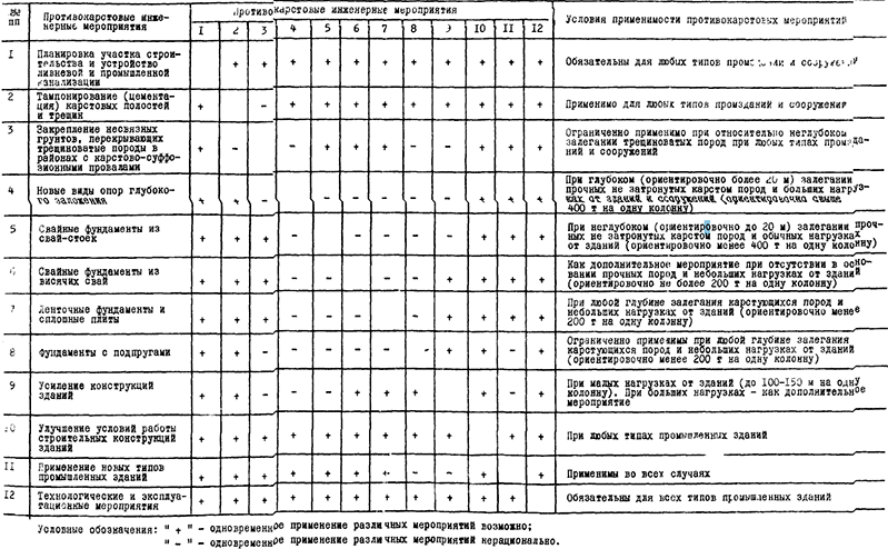 Табл. 3 - Возможные сочетания различных противокарстовых мероприятий и условия их применения