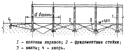 При сосредоточенных нагрузках от зданий ориентировочно до 200 т на одну колонну и при отсутствии агрессивных воздействий в основании, в отдельных случаях могут быть применены фундаменты с подпругами-вантами. В этом случае отдельные фундаменты под колоннами связываются между собой системой перекрестных металлических вант, как показано на рис. 1.