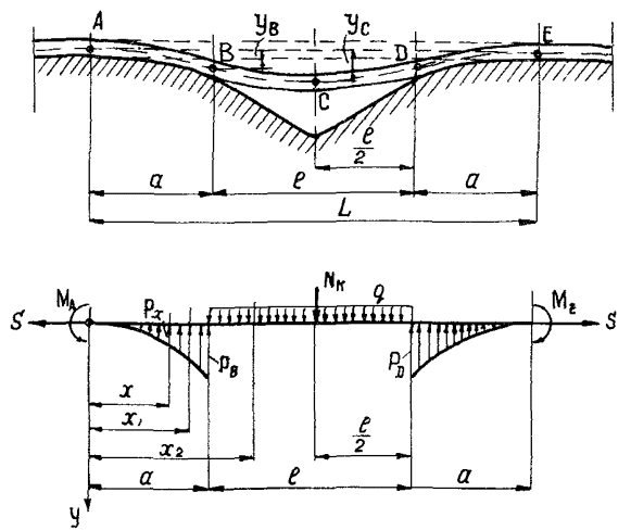 2. Задавшись расчетным диаметром провальной воронки под фундаментом, вычисляем приближенно величины расчетных усилий в балке, дополнительные осадки (прогибы) балки и другие параметры, описанные в пунктах ниже. Рассчитываемый ленточный фундамент (балка) приведена на рис. 6 с действующими нагрузками и размерами.