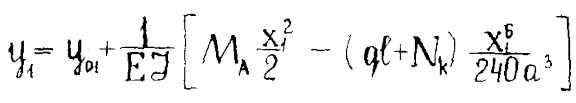 13. Вычисляем прогиб фундамента в любом сечении участка АВ (см. рис. 6) на расстоянии x1 от начала координат, где 0 < x1 < a, принимая значение y01 равным прогибу в рассматриваемом сечении фундамента, найденному ранее при расчете фундамента как на сплошном упругом основании (без учета карстового провала), по формуле: