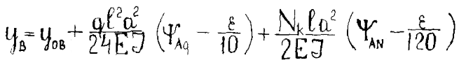 14. Вычисляем прогиб фундамента в т. В (см. рис. 6), т.е. на расстоянии x1 = a от начала координат, где y0B принимаем равным прогибу в рассматриваемом сечении фундамента, найденному ранее при расчете фундамента как на сплошном упругом основании (без учета карстового провала), по формуле: