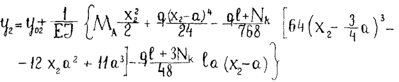 15. Вычисляем прогиб фундамента в любом сечении участка ВС (см. рис. 6) на расстоянии x2 от начала координат, где 0 < x2 < a + l/2, принимая значение y02 равным прогибу в рассматриваемом сечении фундамента, найденному ранее при расчете фундамента как на сплошном упругом основании (без учета карстового провала), по формуле: