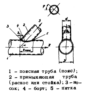 Особенностью расчета является то, что сварные швы, входящие в состав рассматриваемлого соединения рассматриваются как угловые и как стыковые в зависимости от взаимного положения прикрепляемой трубы и образующей другой трубы. Кроме того, в каждом из этих видов швов следует выделять носковую и пяточную части (соединение похоже на конфигурацию стопы человека, см. рис. 1). Под 'носковой' и 'пяточной' частями сварного шва в соединении двух труб подразумеваются участки сварного шва, приходящиеся каждый на половину сечения прикрепляемой трубы и расположенные соответственно со стороны тупого и острого углов пересечения осей труб.
