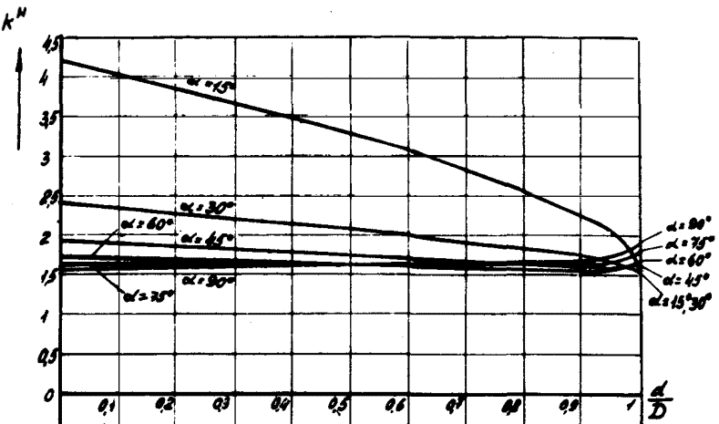 4. Определяем коэффициент носковой части шва kН по графику на рис. 2 в зависимости от отношения диаметров труб, где d - диаметр прикрепляемой трубы, и угла прикрепления α.