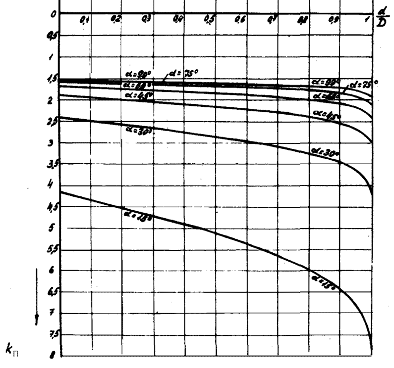 5. Определяем коэффициент пяточной части шва kП по графику на рис. 3 в зависимости от отношения диаметров труб, где d - диаметр прикрепляемой трубы, и угла прикрепления α.