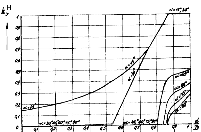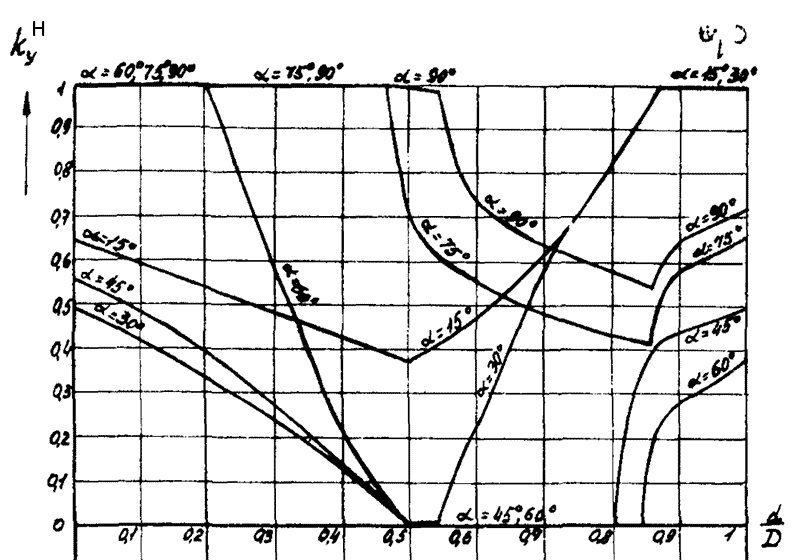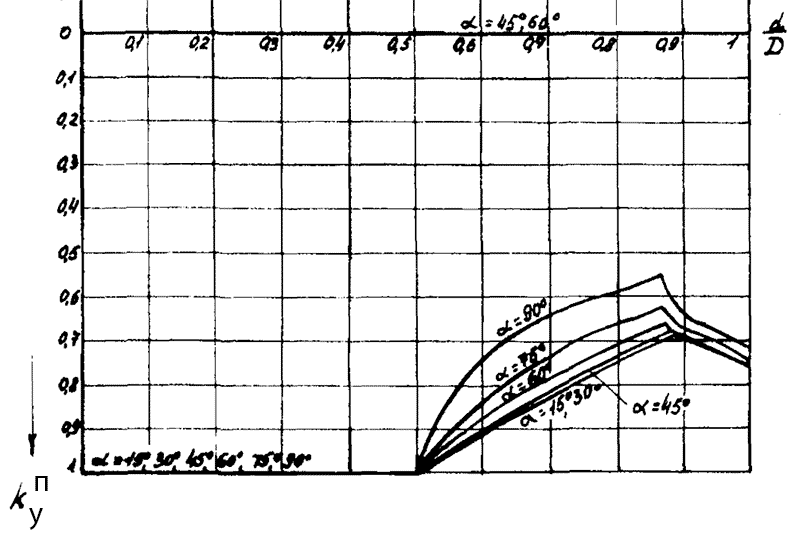 7. Определяем коэффициент носковой части углового шва kНУ по графику на рис. 4 в зависимости от отношения диаметров труб, где d - диаметр прикрепляемой трубы, и угла прикрепления α. График применяется при газовой резке труб без скоса кромки.