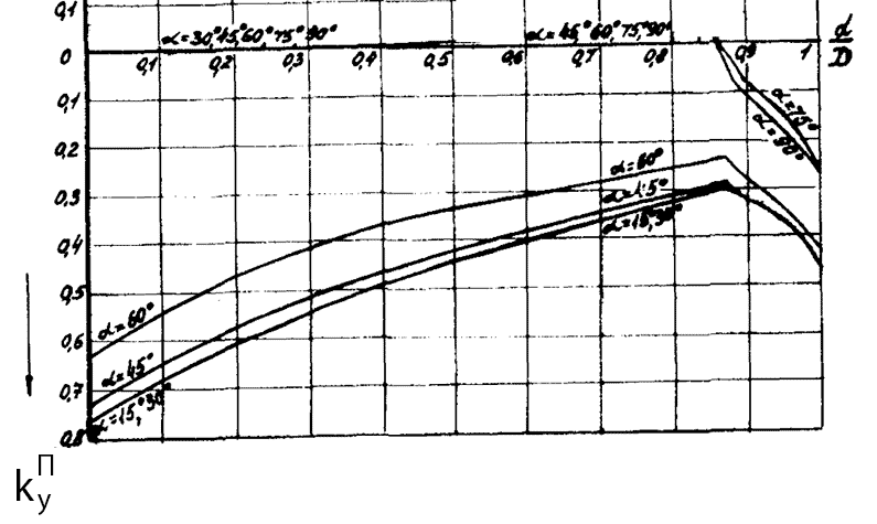 8. Определяем коэффициент пяточной части углового шва kПУ по графику на рис. 5 в зависимости от отношения диаметров труб, где d - диаметр прикрепляемой трубы, и угла прикрепления α. График применяется при газовой резке труб без скоса кромки.