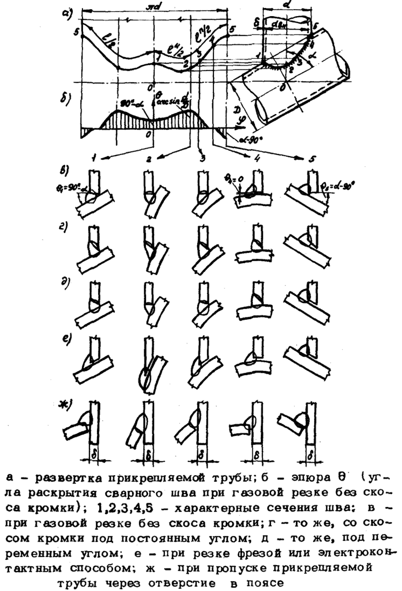 в) при резке труб фрезой или электроконтактным способом без последующей разделки кромок (рис. 6 е), а также в случае соединения с пропуском примыкающего элемента через отверстие в поясе (рис. 6 ж) - всю длину шва,