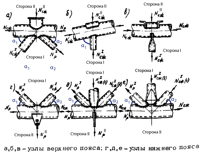 ,Допускается при проверке несущей способности по первому из неравенств, приведенных выше, принимать в качестве NСЖI, II наибольшие расчетные усилия в сжатых примыкающих элементах, а значения NРI устанавливать из условия равновесия узла. Соответственно, при проверке по второму из неравенств, приведенных выше, допускается принимать наибольшие расчетные значения NРI, II, устанавливая значения NСЖI из условия равновесия узла.