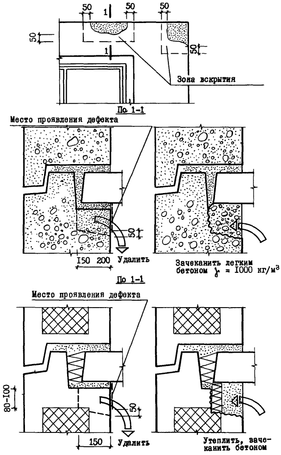 В местах удаления теплопроводных включений со стороны помещения полости следует заполнять монолитным легким бетоном на пористых заполнителях плотностью 1000 - 1100 кг/м3 с последующей затиркой отремонтированных мест цементным раствором.