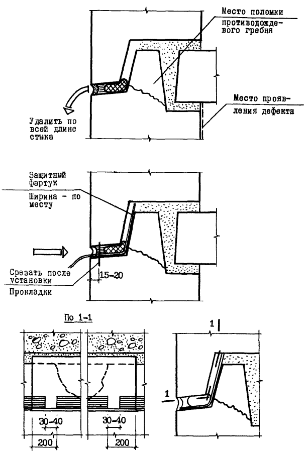 При превращении открытых стыков в дренированные или закрытые следует осуществить их герметизацию с заполнением устий нетвердеющими герметизирующими мастиками по установленным вплотную к водоотбойному экрану уплотняющим прокладкам (рис. 6) и последующей расшивкой швов полимерцементным раствором.