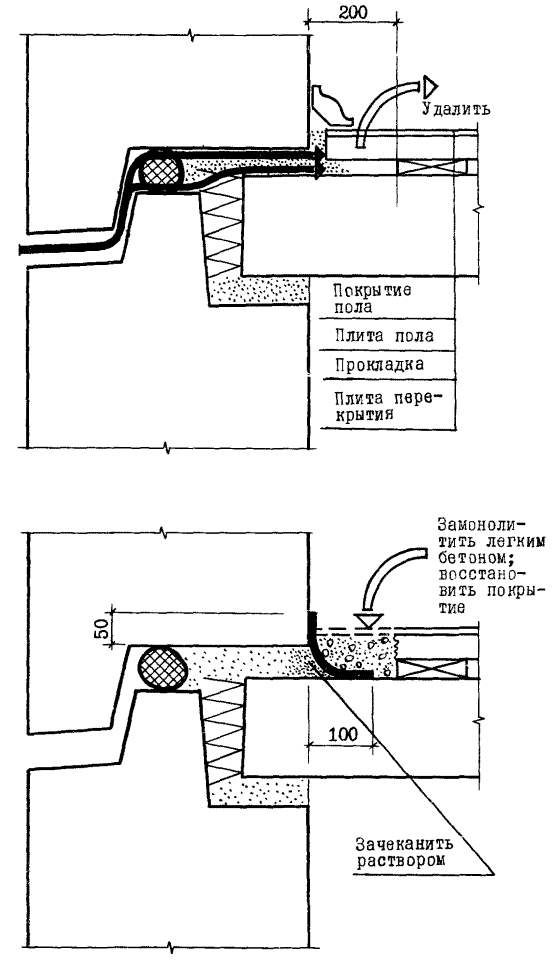 Превращение открытых стыков в закрытые; нанесение слоя напыляемой теплоизоляции (шириной не менее 0,2 м и толщиной 2,5 - 3 мм) под потолком в месте примыкания плиты перекрытия к наружной стеновой панели |