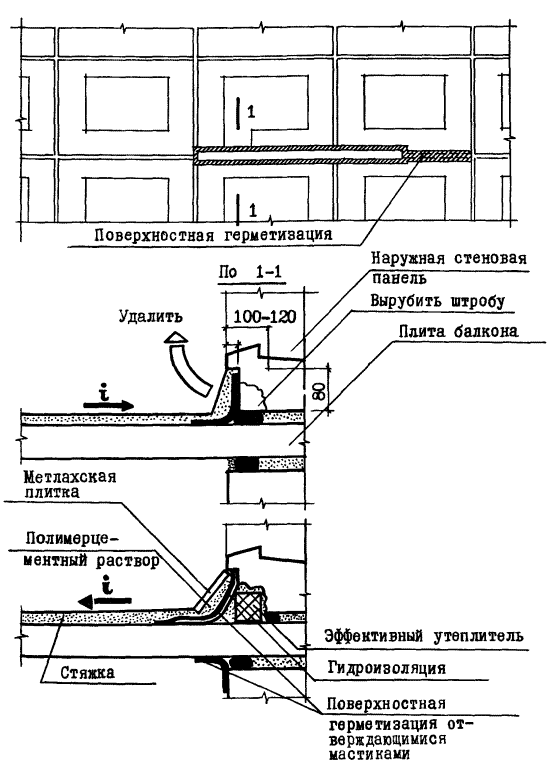 Удаление (в случае ее наличия) цементной стяжки пола с плиты балкона (лоджии); подготовка ремонтируемых стыков; ремонтно-восстановительная герметизация стыков; восстановление цементной стяжки с приданием ей требуемого уклона и устройством откоса в месте примыкания к наружной стеновой панели |