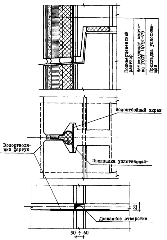 В случае устройства дренированных стыков необходимо проверить установку водоотводящих фартуков (сливов) и предусмотреть в заполнении устий стыков соответствующие разрывы.