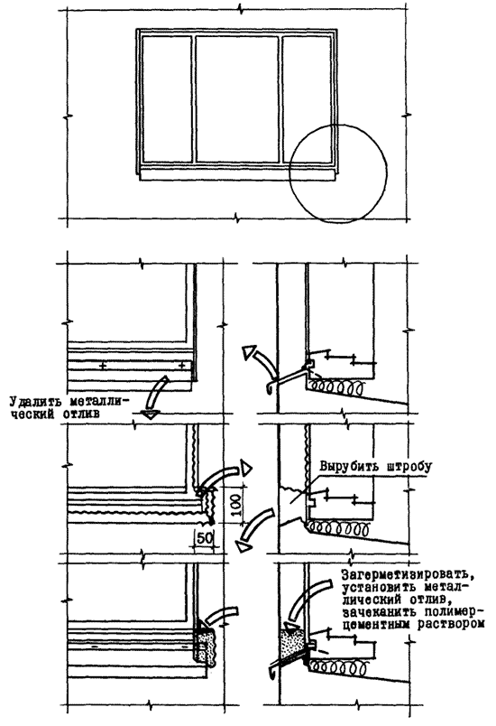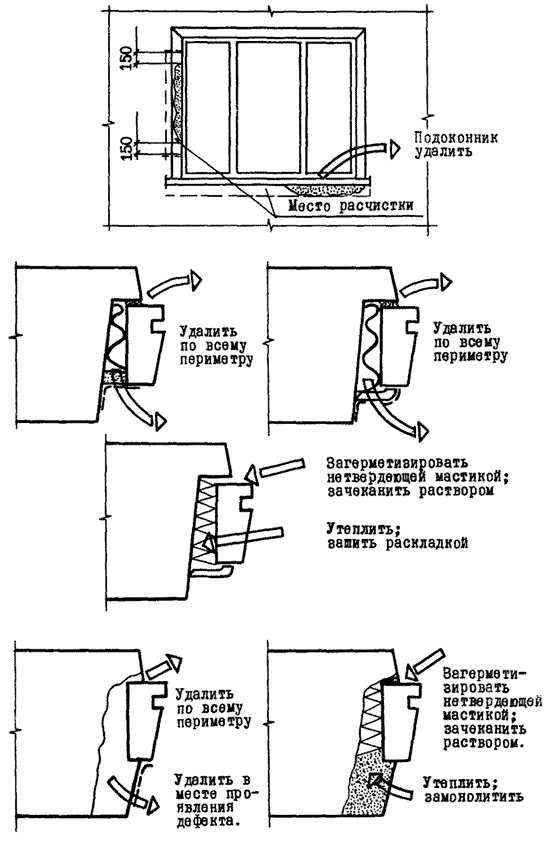 Вскрытие и расчистка со стороны помещения стыков (пазух) по периметру окна; удаление теплопроводных включений (при их наличии); ремонтно-восстановительное утепление стыков по периметру окна. В случаях, когда оконные блоки были установлены в процессе формования панелей: расшивка и герметизация трещин при их наличии в четвертях проемов; удаление со стороны помещения теплопроводных включений (при их наличии); проведение ремонтно-восстановительных работ с применением легкого бетона на пористых заполнителях |